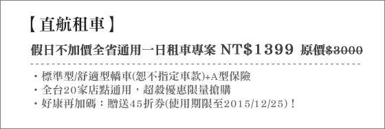 ●超值優惠價1399元全日租車,全省通用!輕鬆省荷包,替你精打細算