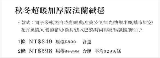 商品訊息簡述: 平均每條最低只要299元起(含運)即可購得秋冬超暖加厚版法蘭絨毯1條/2條,多款可選。