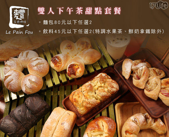 商品訊息簡述: 只要149元(雙人價)即可享有【麷手感烘焙】原價250元雙人下午茶甜點套餐:80元以下麵包x2+45元飲料x2(特調水果茶、鮮奶拿鐵除外)。