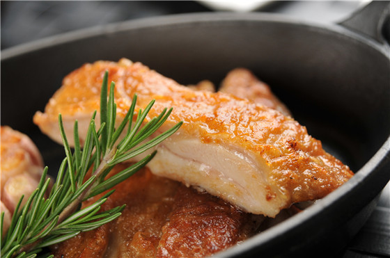 選用雞腿肉部位,主廚以精湛料理手法,將表皮煎至香脆可口,雞肉料理汁多味美,齒頰留香。