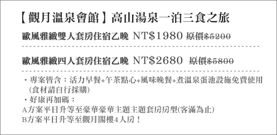 商品訊息簡述: 只要1980元起即可享【觀月溫泉滅]】原價最高5800元高山湯泉一泊三食之旅:(A)歐風雅緻雙人套房住宿乙晚/(B)歐風雅緻奶H套房住宿乙晚,專案皆含:活力早餐+午茶點心+風味晚餐+煮溫泉蛋池設施免費使用(食材請自行採購)。好康再加碼:A方案平日升等至豪華主題套房房型(客滿為止)、B方案平日升等至觀月閣樓4人房!