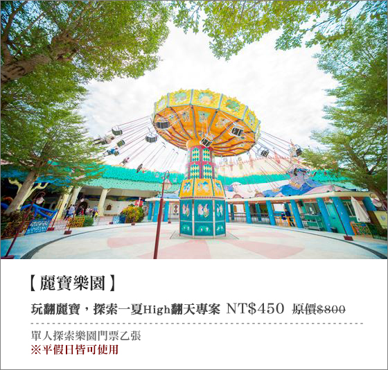 商品訊息簡述: 只要450元即可享有【麗寶樂園】原價800元玩翻麗寶,探索一夏High翻天專案:單人探索樂園門票乙張。平假日皆可使用!